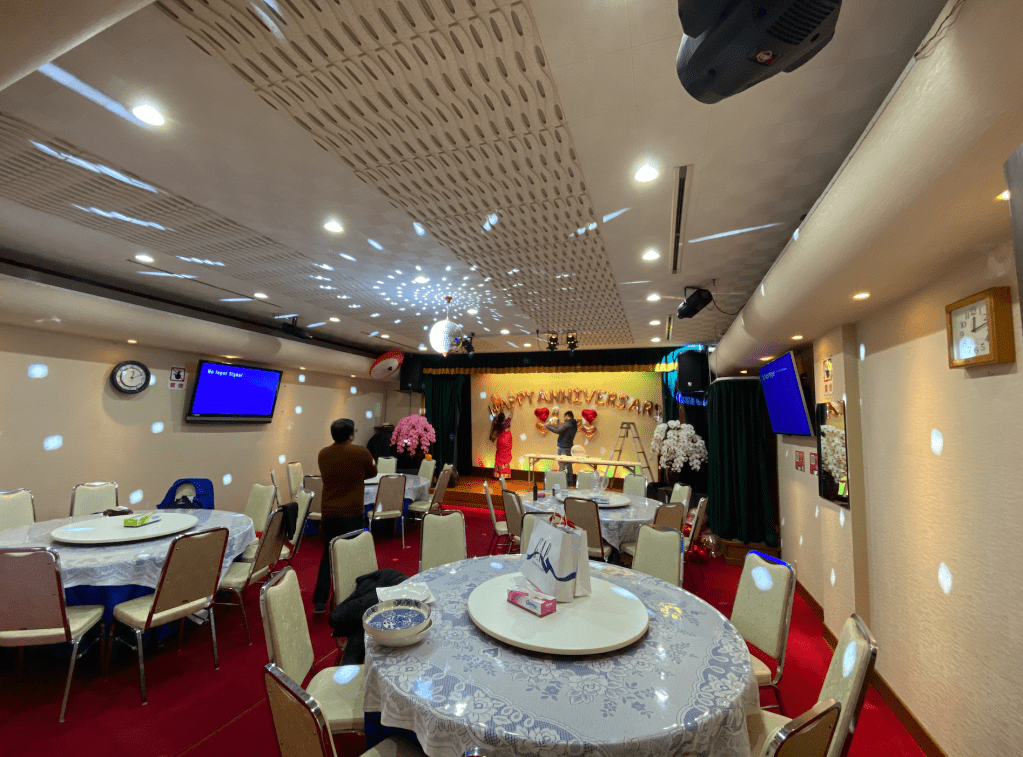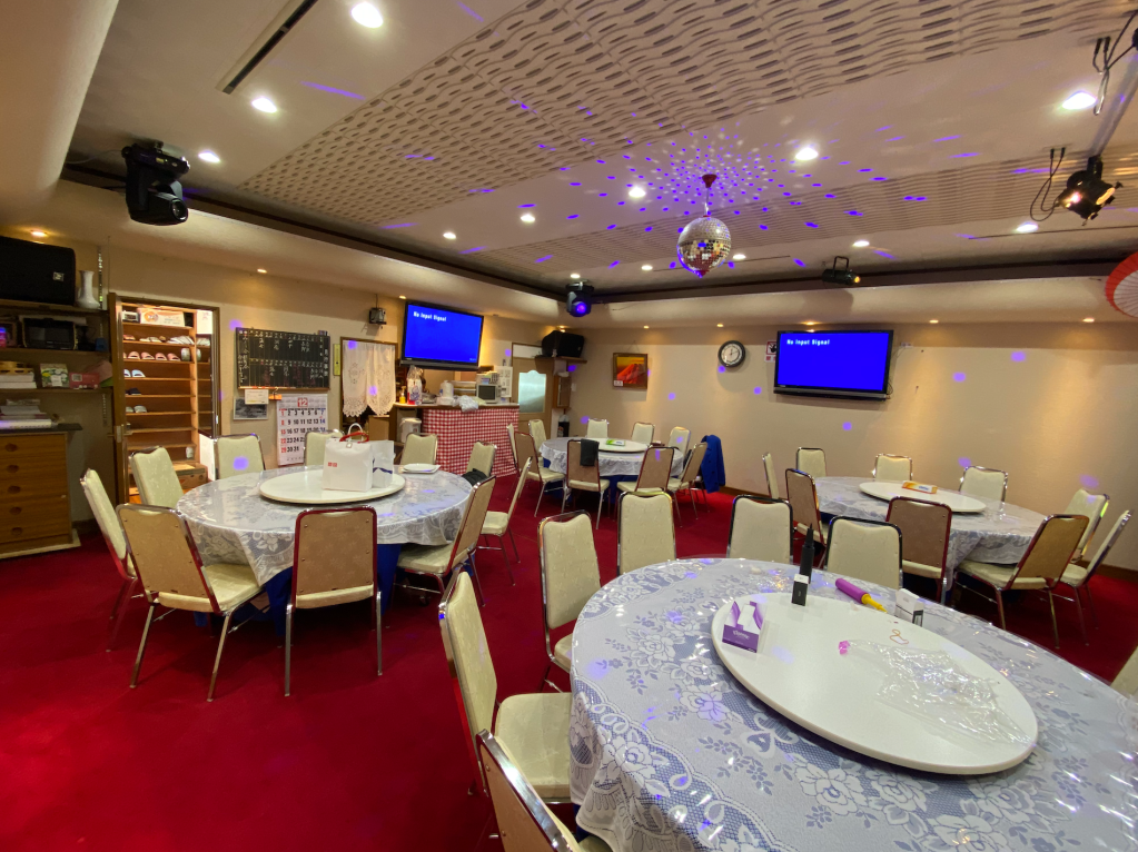 今回はお子様が何人かいらっしゃったので、プロジェクターは壊してしまうと怖いということで使用しませんでしたが、モニターと同じように、ステージの白壁をスクリーンとして映し出すこともできます!